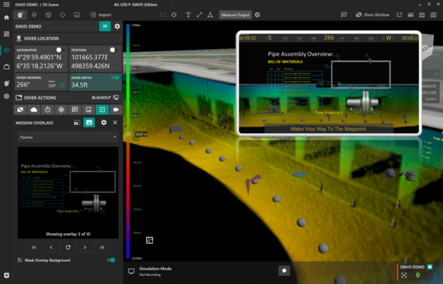 The DAVD system can be used either in "rapid" deployment scenarios where minimal prior information is known or scanned, or in "Simulation and Planning" scenarios where a detailed prior 3D map of the scene is created and then annotated by the Diver and Supervisor. The latter scenario affords the greatest functionality and is particularly beneficial for repeat dives on a work site, such as a salvage operation, where data, information and spatial context can be built in real-time and incorporated into the mission for subsequent dives. Through the use of the 4G Underwater Survey Explorer DAVD Edition software package and the supporting equipment, the diver can then receive a range of real-time display information including: